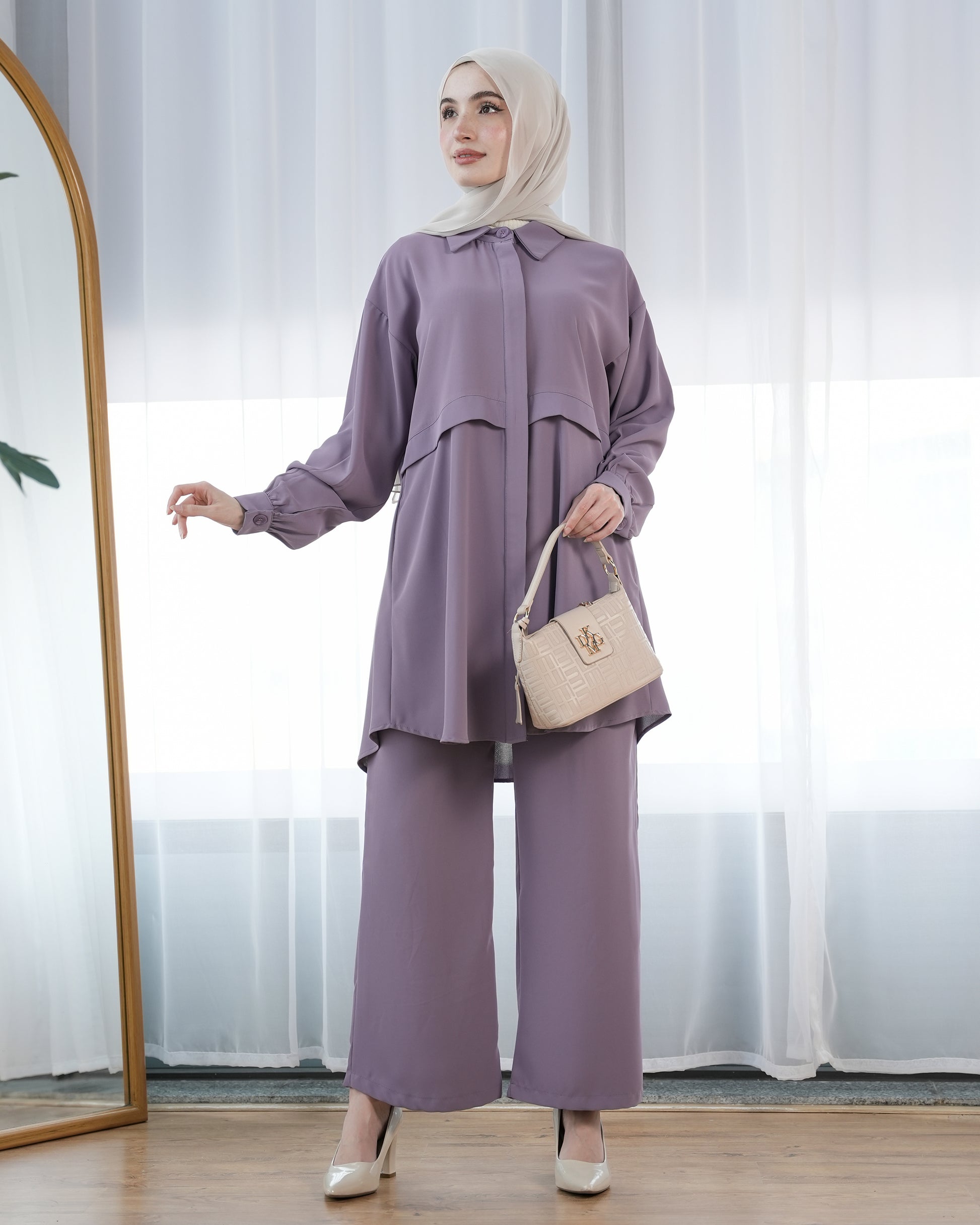 Chic Modest Set with Button-Up Top and Flowing Skirt:9320