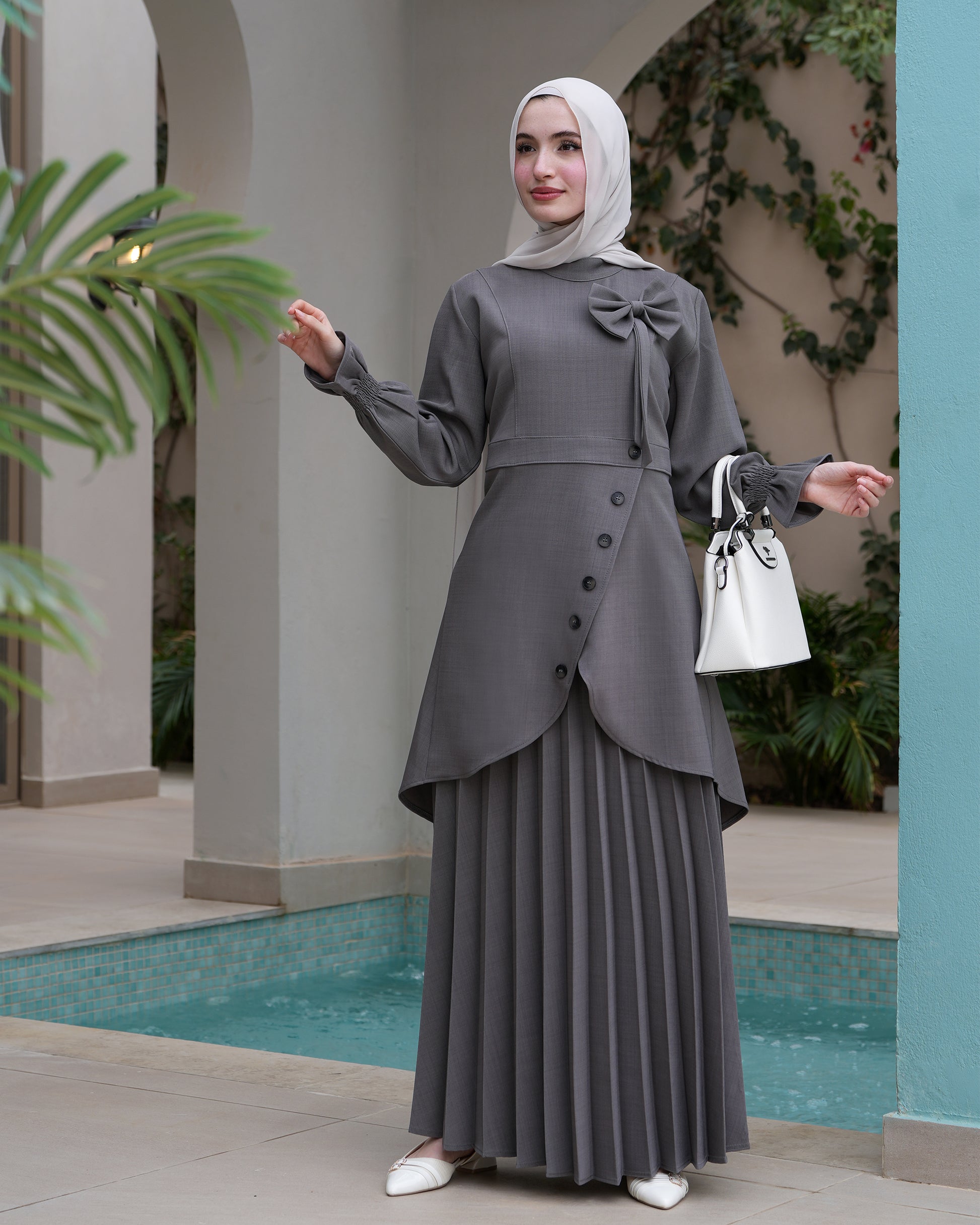 chic two-piece set featuring an elegant tunic with a stylish bow detail and decorative buttons, paired with a soft pleated skirt. Designed with a graceful, comfortable fit that gives a refined and feminine look—perfect for Eid and special occasions.